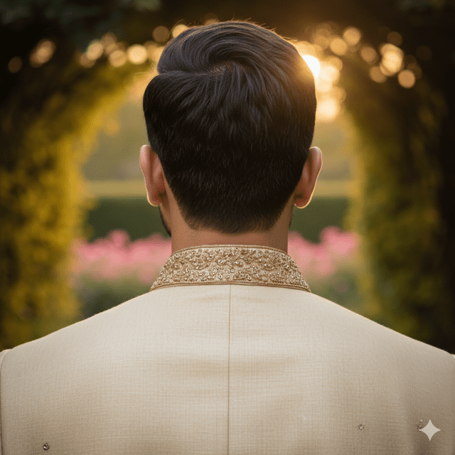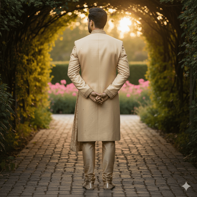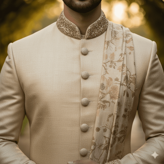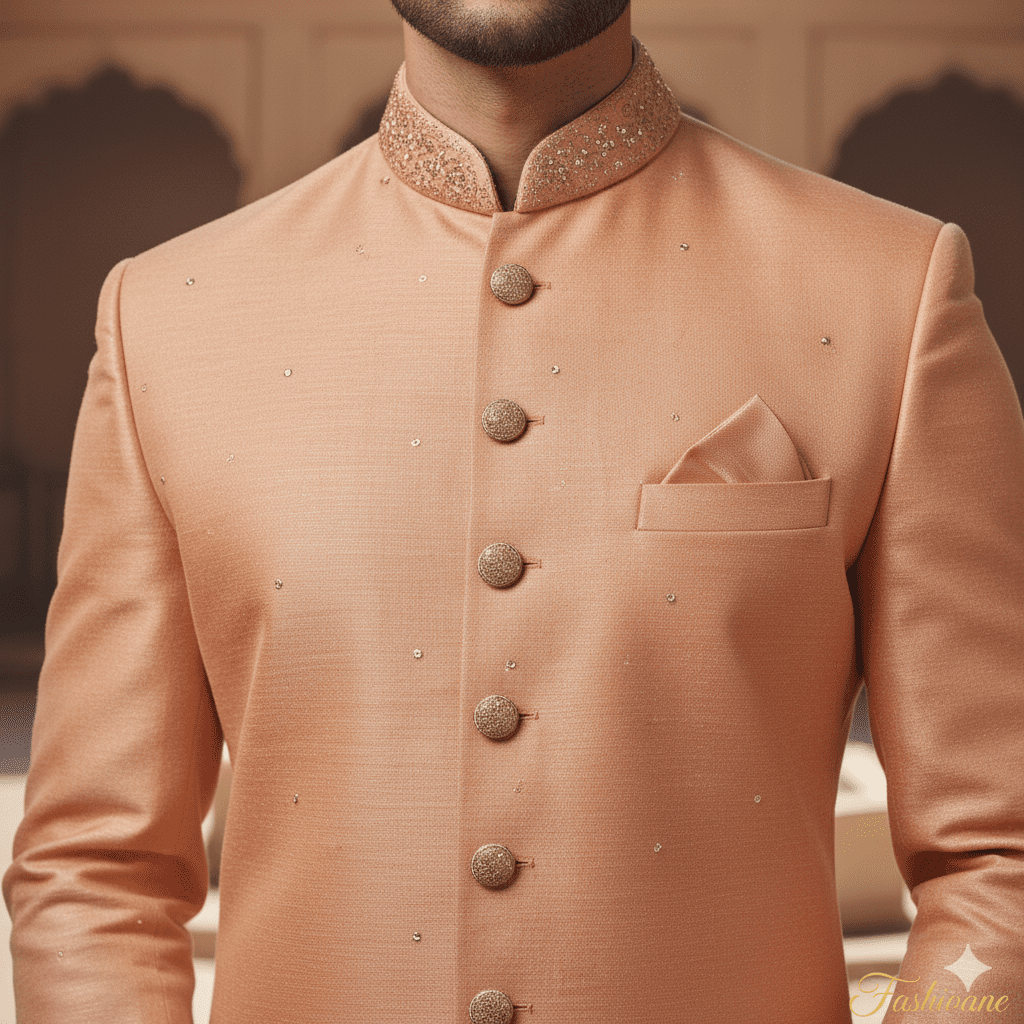 Contemporary champagne silk sherwani featuring modern slim-fit silhouette and minimal embroidery. Includes silk sherwani with mandarin collar, matching kurta, trouser-style bottom, and printed dupatta. Material: Pure silk with cotton lining. Embroidery: Minimalist thread work and sequins. Weight: 1.8 kg. Color: Champagne gold. Size: Stitched to measure (chest 36-46 inches). Length: Short length (36-38 inches). Care: Dry clean recommended. Occasion: Perfect for reception, cocktail, sangeet. Indo-western fusion by Fashioane.