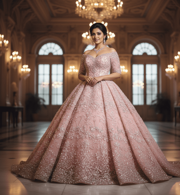 Ethereal champagne tulle A-line wedding gown with crystal embellishments. Features A-line gown, sweetheart neckline, chapel train. Material: Tulle with satin lining. Embellishments: Crystals and beads. Weight: 3.2 kg. Color: Champagne. Size: Custom. Care: Dry clean only. Occasion: Church weddings, receptions. Fashioane romantic gowns.