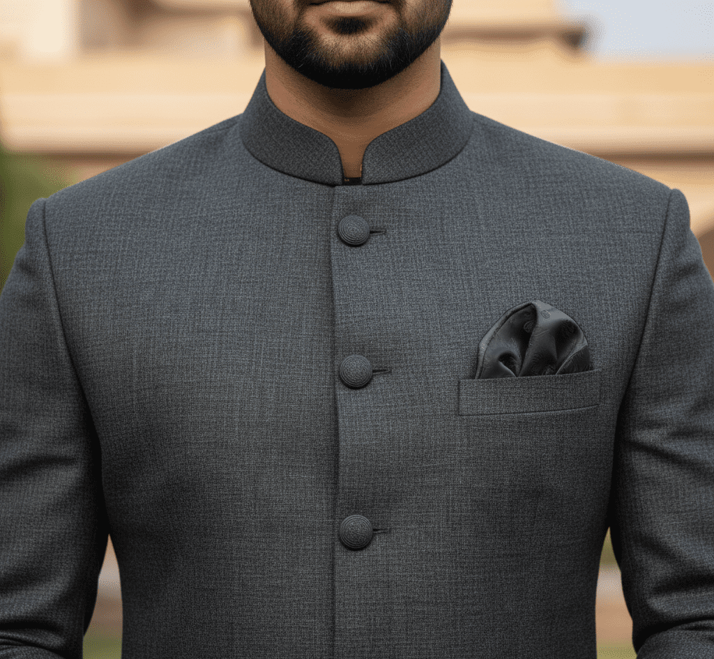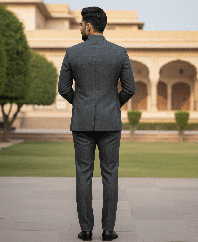 Sharp charcoal grey wool jodhpuri suit.