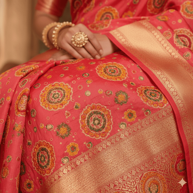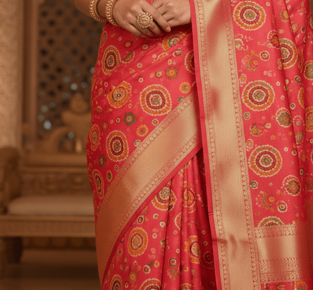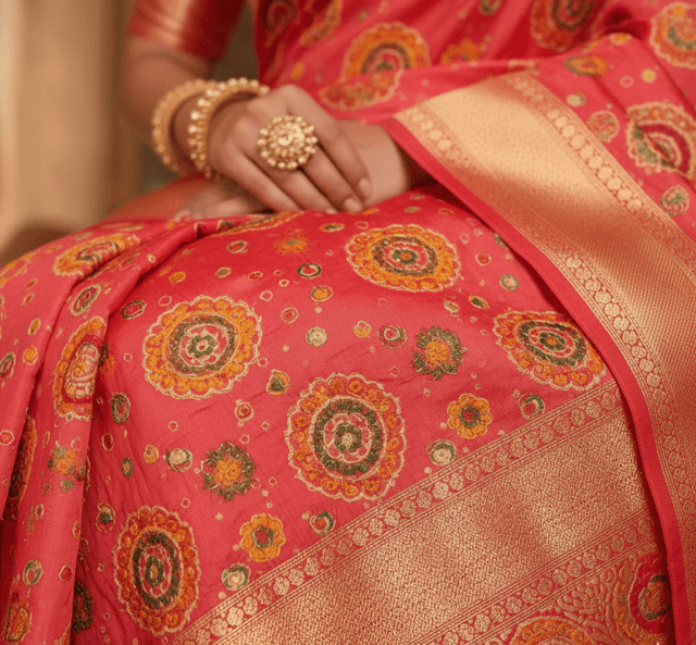 Vibrant coral pink bandhani saree with traditional tie-dye.