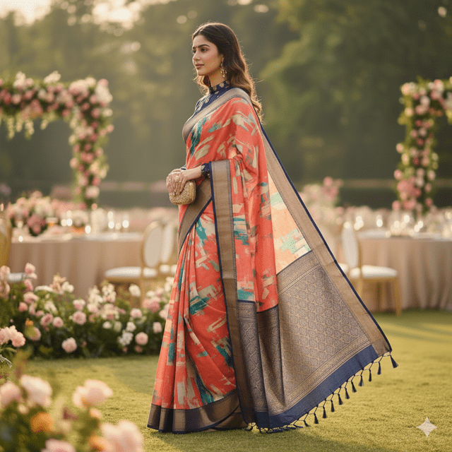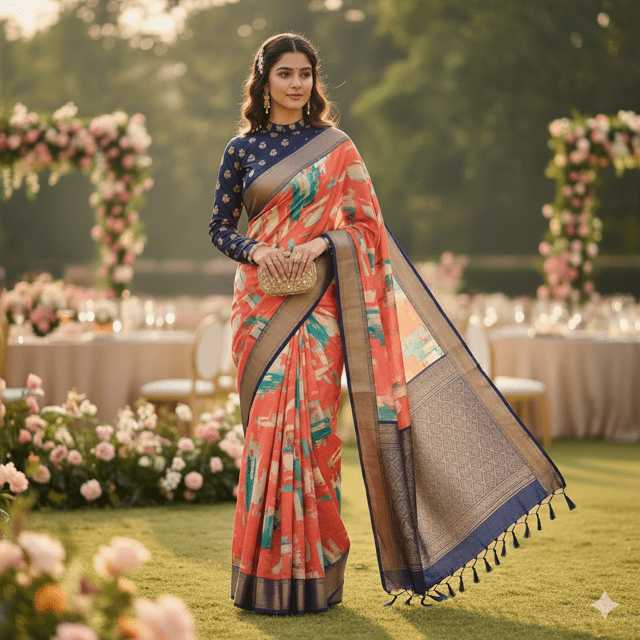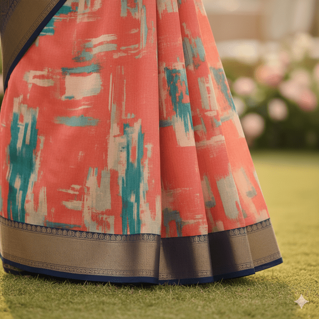 Modern coral silk saree with contemporary digital print and contrast border. Includes 5.5-meter saree with designer blouse piece. Material: Silk blend. Work: Digital print with border. Weight: 0.8 kg. Color: Coral. Blouse: Un-stitched contrast fabric. Saree: With attached borders. Care: Gentle dry clean. Occasion: Daytime weddings, receptions. Fashioane contemporary collection.