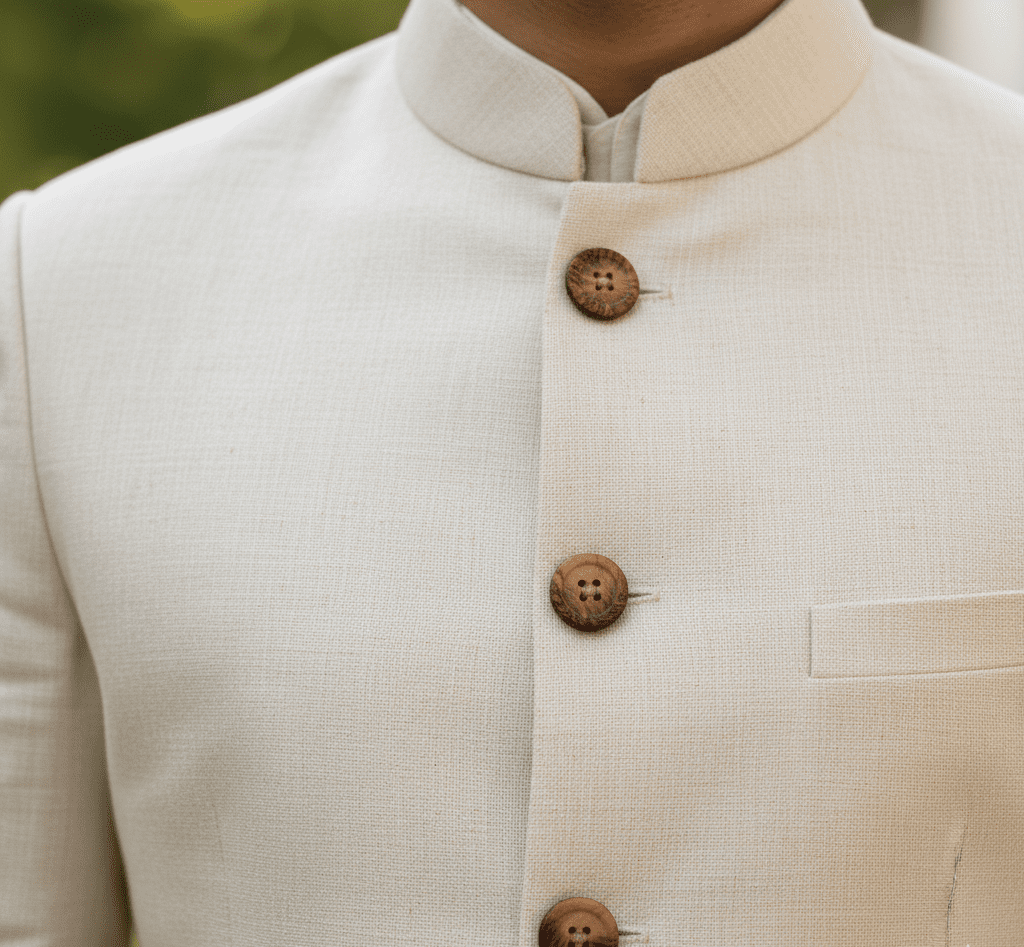 Breathable cream linen Nehru jacket suit for summer.