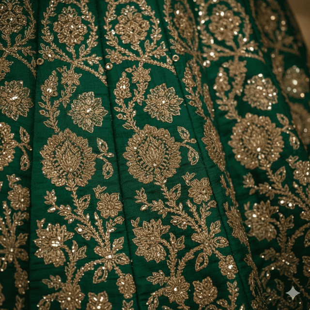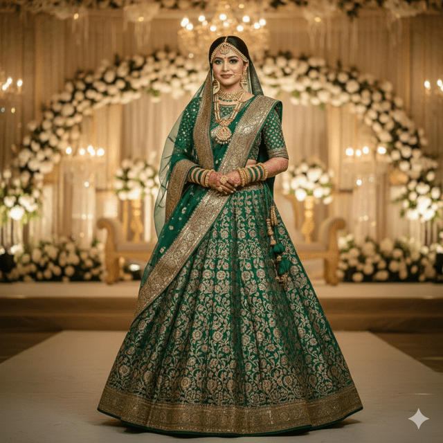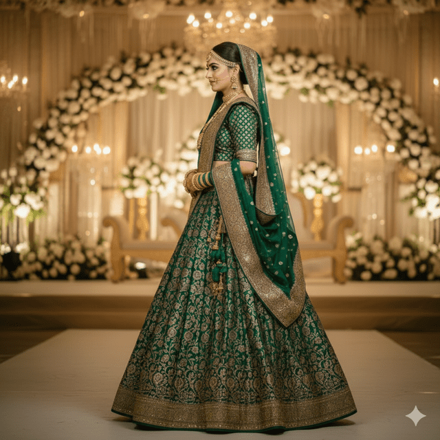 Opulent emerald green Banarasi silk lehenga with traditional brocade work.