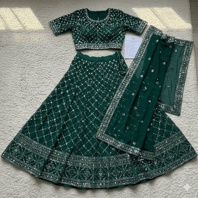 Stunning emerald green georgette guest lehenga with mirror work. Features georgette lehenga, blouse, dupatta. Material: Georgette. Work: Mirror and sequin. Weight: 2.1 kg. Color: Emerald green. Size: Semi-stitched. Care: Dry clean. Occasion: Wedding guest, festive. Fashioane jewel tones.