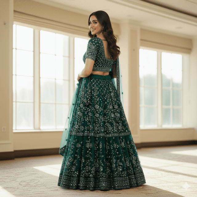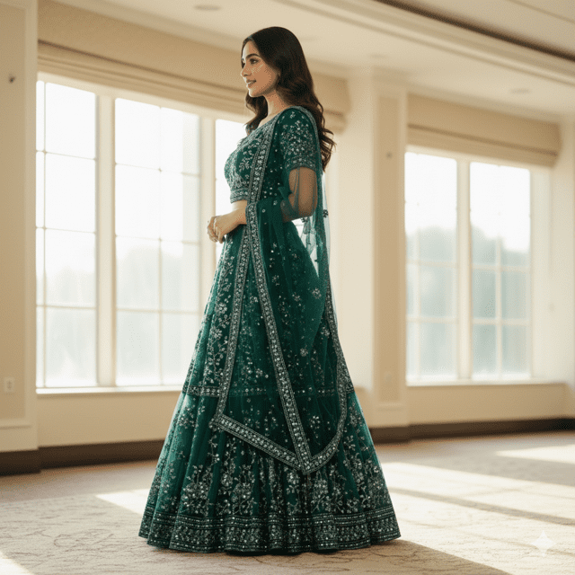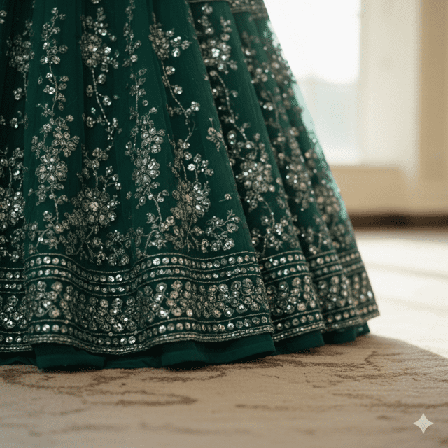 Rich emerald green georgette lehenga for guests.