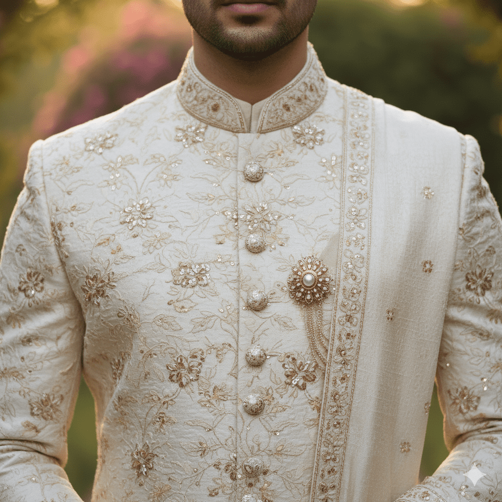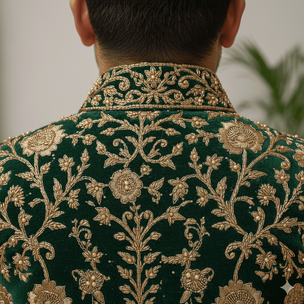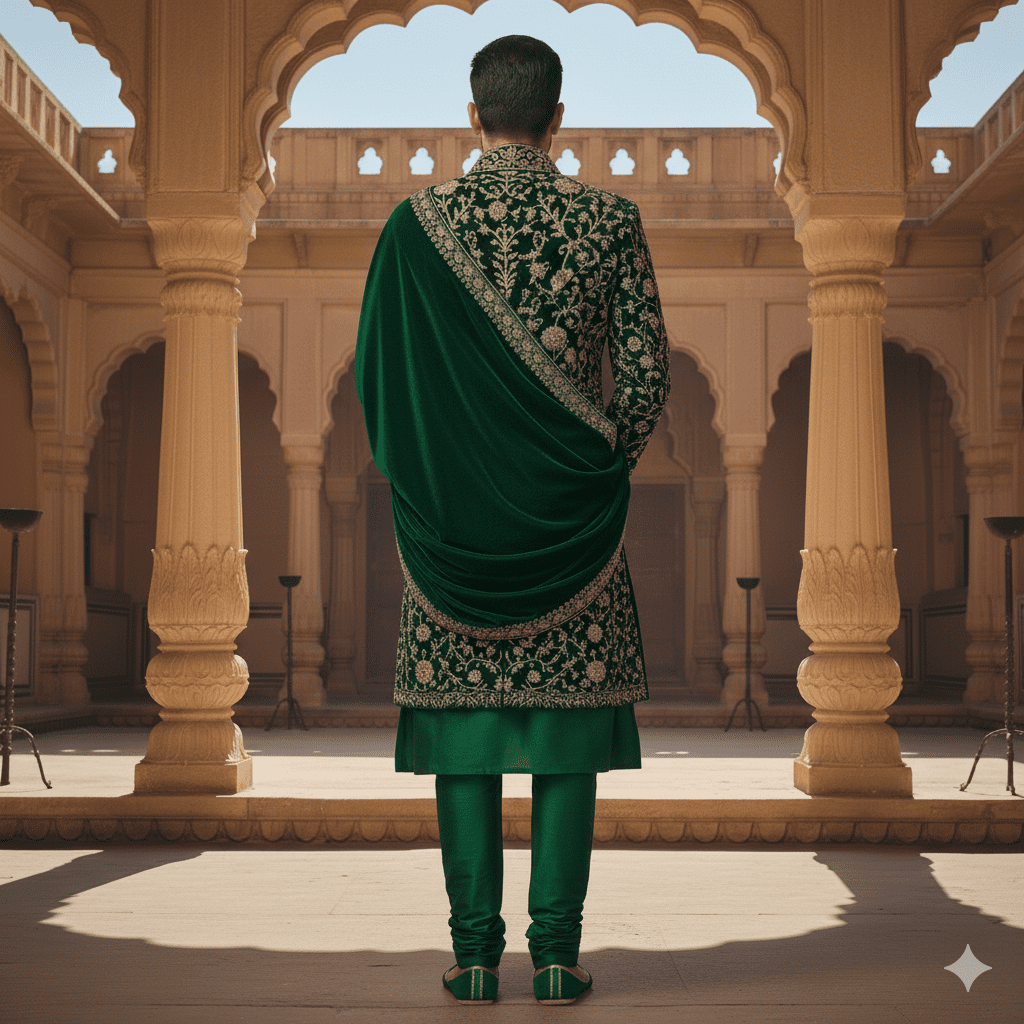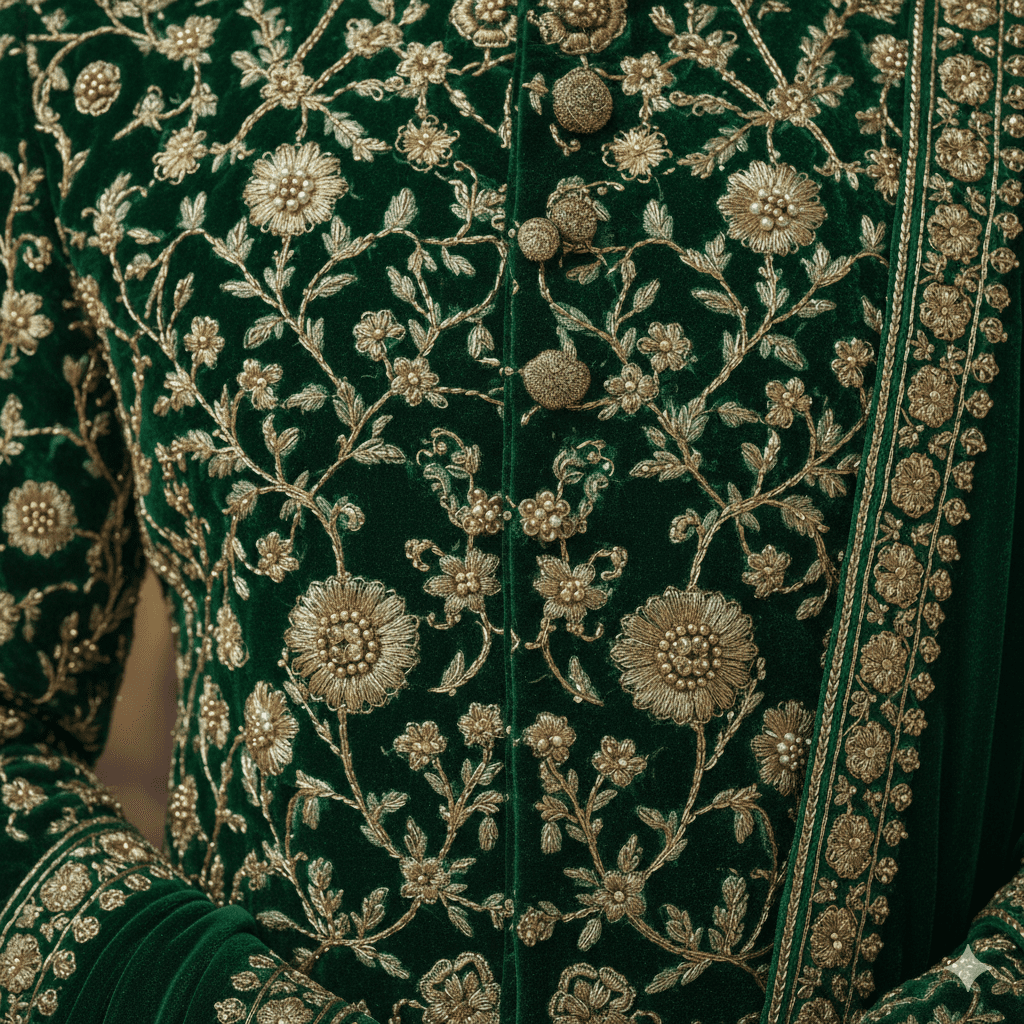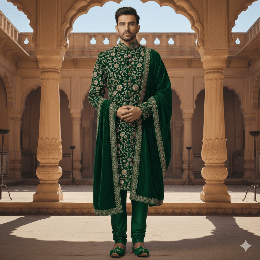 Majestic emerald green velvet sherwani with intricate zardozi embroidery. Includes sherwani, kurta, pajama, stole, and mojari shoes. Material: Premium velvet with satin lining. Embroidery: Zardozi and beadwork. Weight: 3.5 kg. Color: Emerald green with gold. Size: Custom-made (chest 38-50 inches). Care: Professional dry clean. Occasion: Winter weddings, royal themes. Complete groom package by Fashioane.