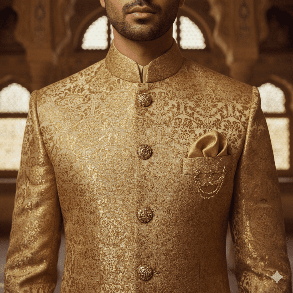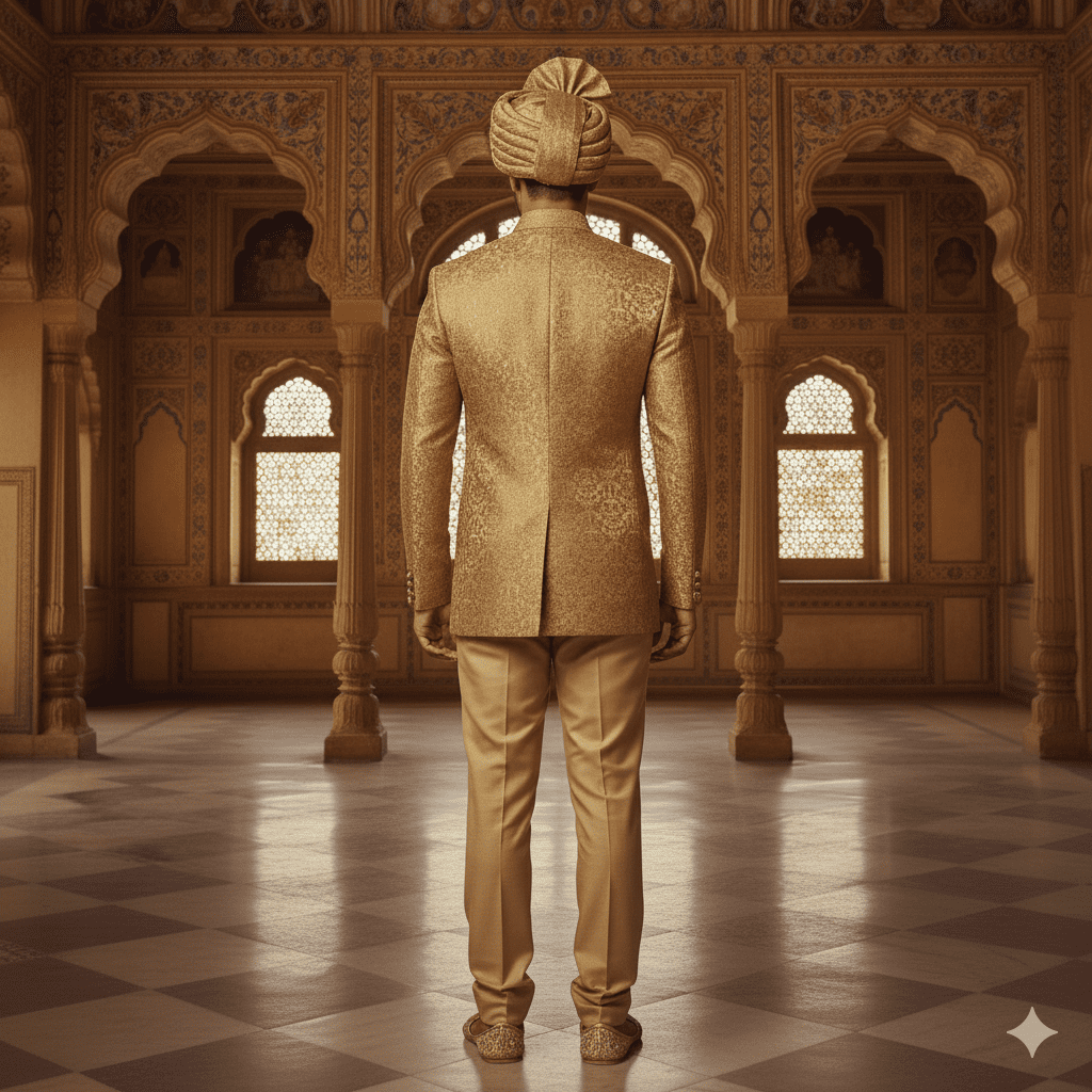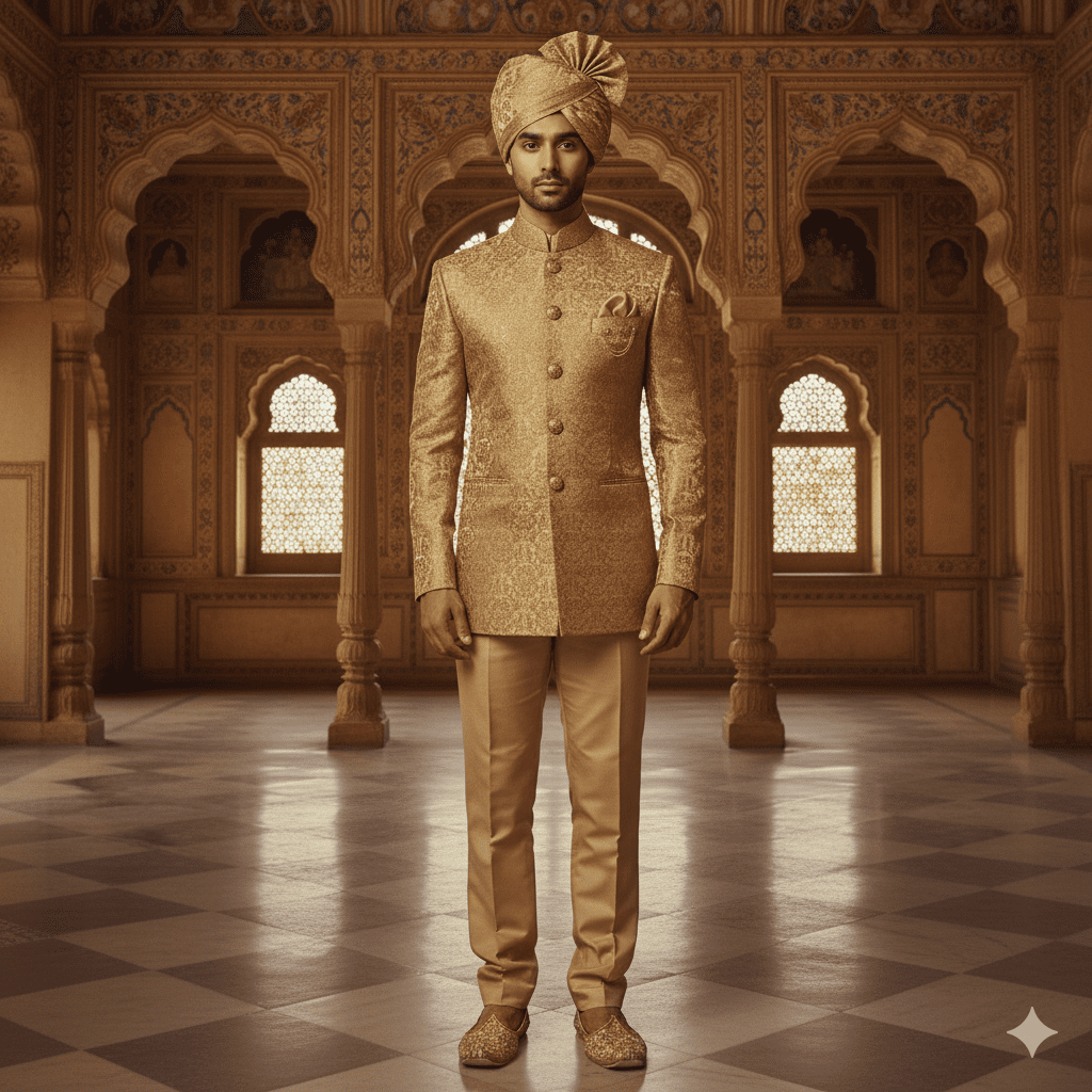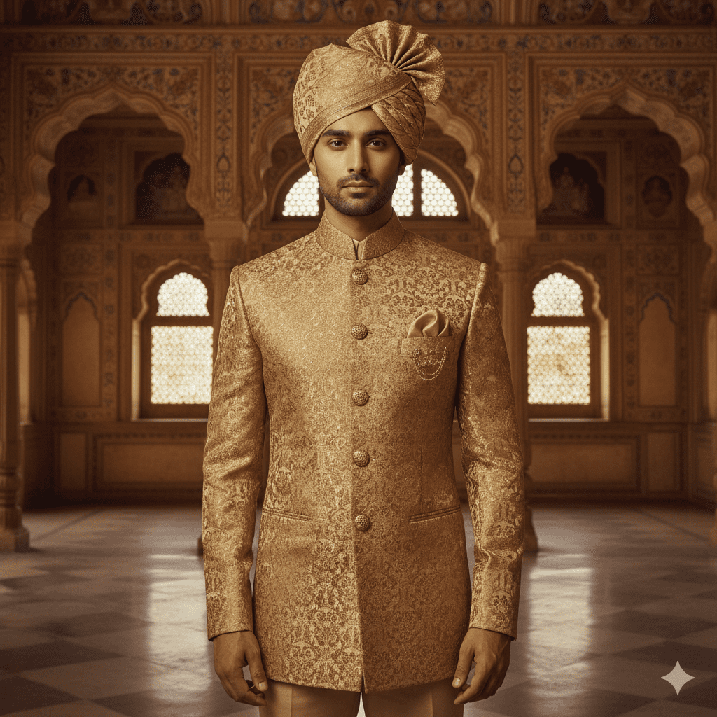 Luxurious gold brocade bandhgala with matching turban.