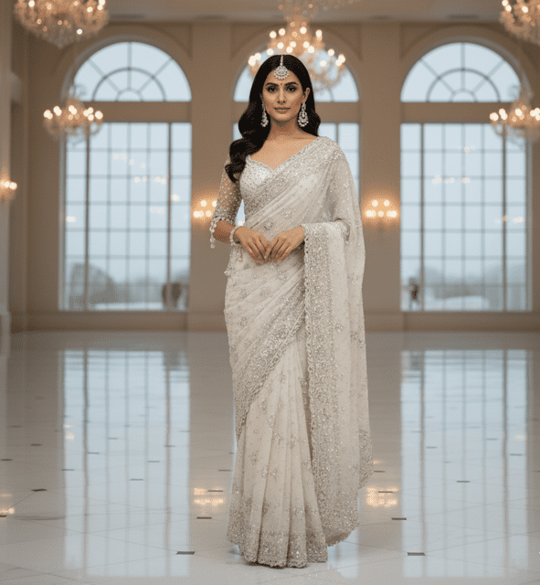 Blouse: Un-stitched matching fabric. Saree: 6 meters with fall and edging.