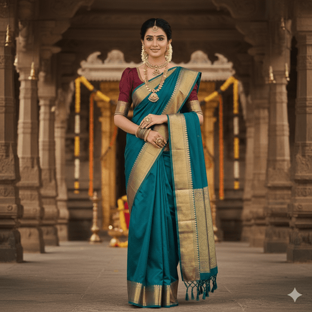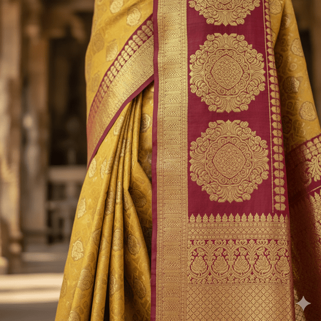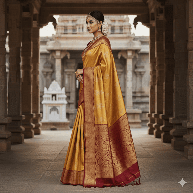 Luxurious gold Kanjivaram silk bridal saree with traditional temple border and contrasting pallu. Includes 6-meter pure Kanjivaram silk saree, matching blouse piece. Material: Pure Kanjivaram silk (9 yards). Work: Temple border weaving, contrast pallu. Weight: 1.5 kg. Color: Gold with maroon border. Blouse: Un-stitched matching fabric. Saree: 6 meters with fall and edging. Care: Dry clean only, avoid direct sunlight. Occasion: Perfect for South Indian weddings, traditional ceremonies. Authentic GI-tagged Kanjivaram from Fashioane.