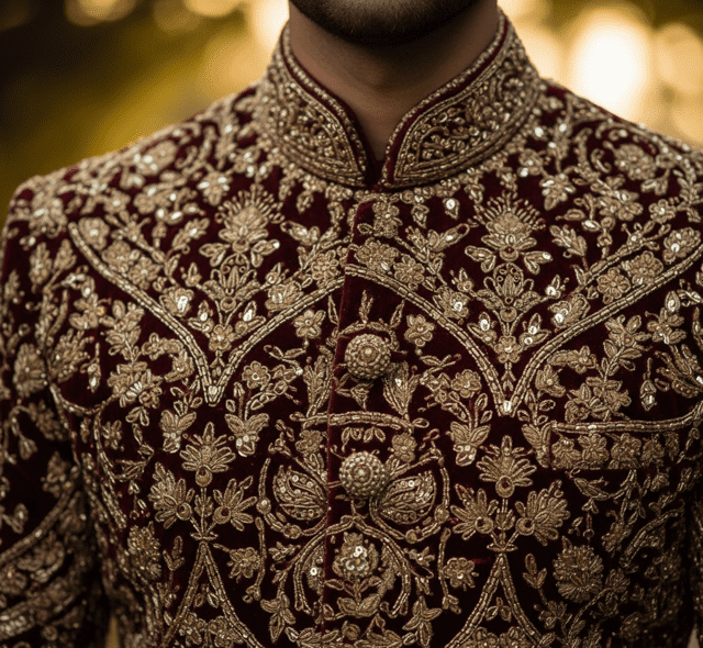 Regal ivory wedding sherwani featuring intricate gold embroidery on collar, cuffs, and front panel. Includes embroidered sherwani with button closure, matching kurta, churidar pajama, and embroidered dupatta. Material: Premium silk blend with viscose lining. Embroidery: Zari, sequins, and threadwork. Weight: 2.5 kg. Color: Ivory with gold embroidery.