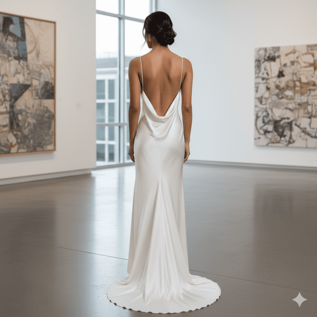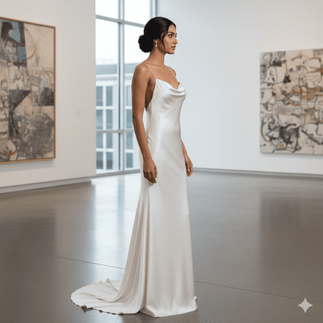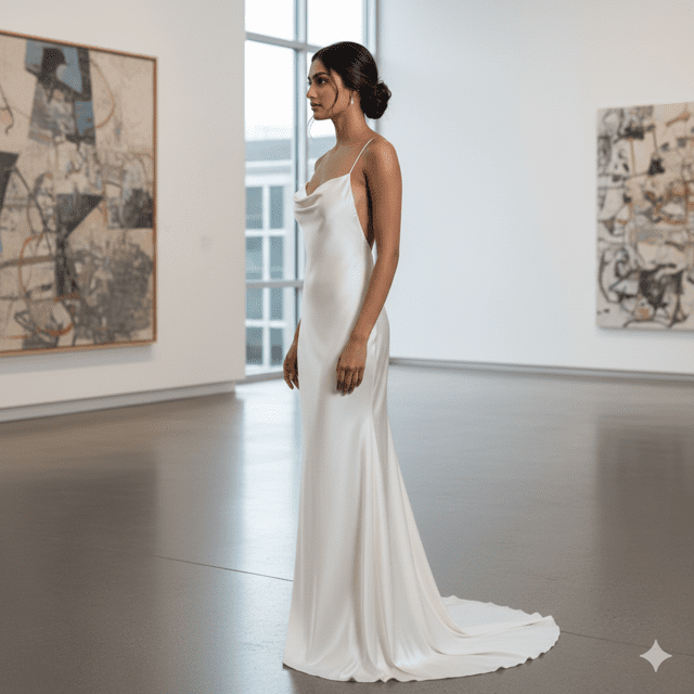 Sleek ivory satin slip gown for minimalist brides.