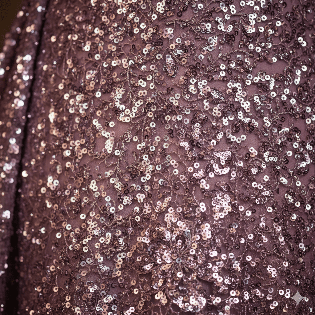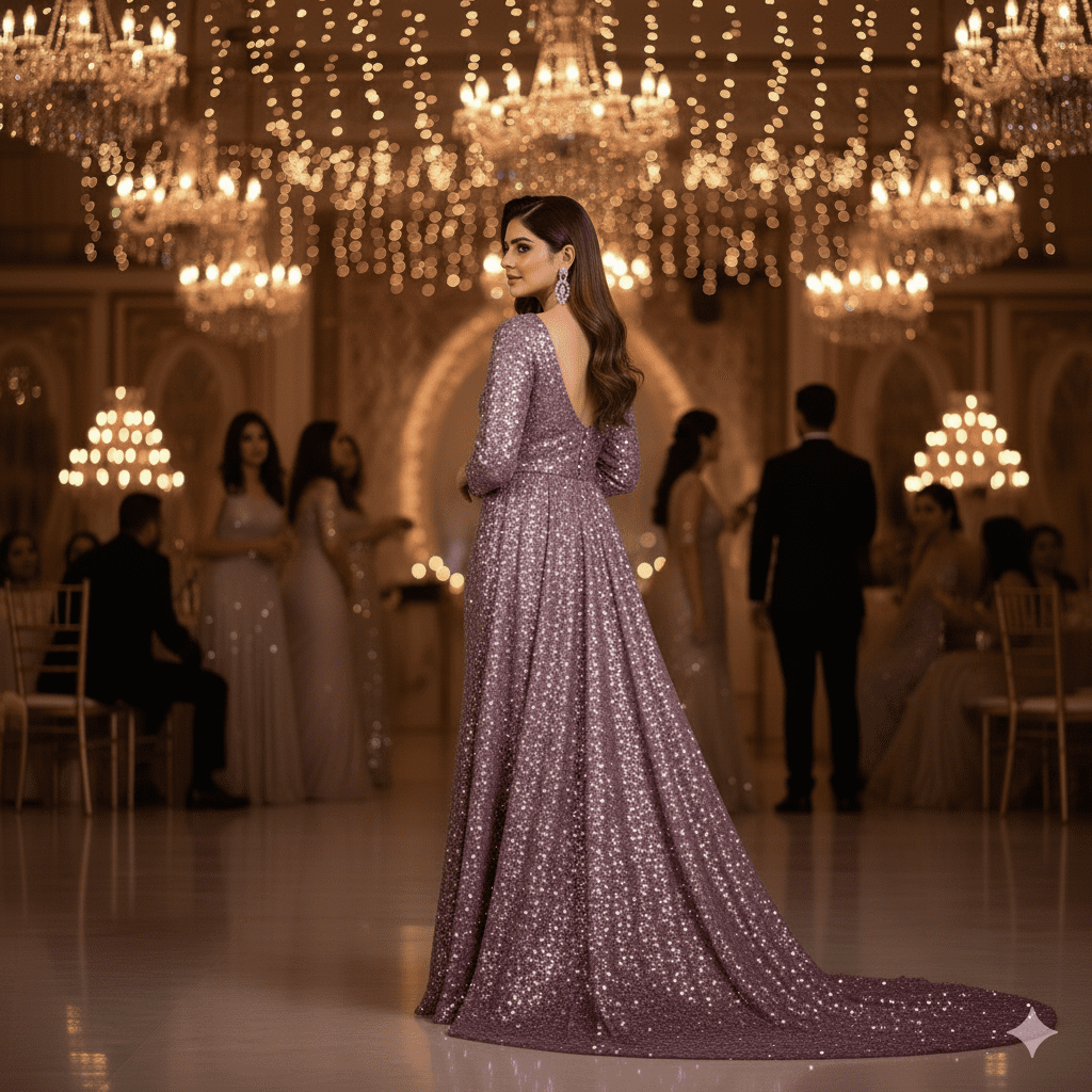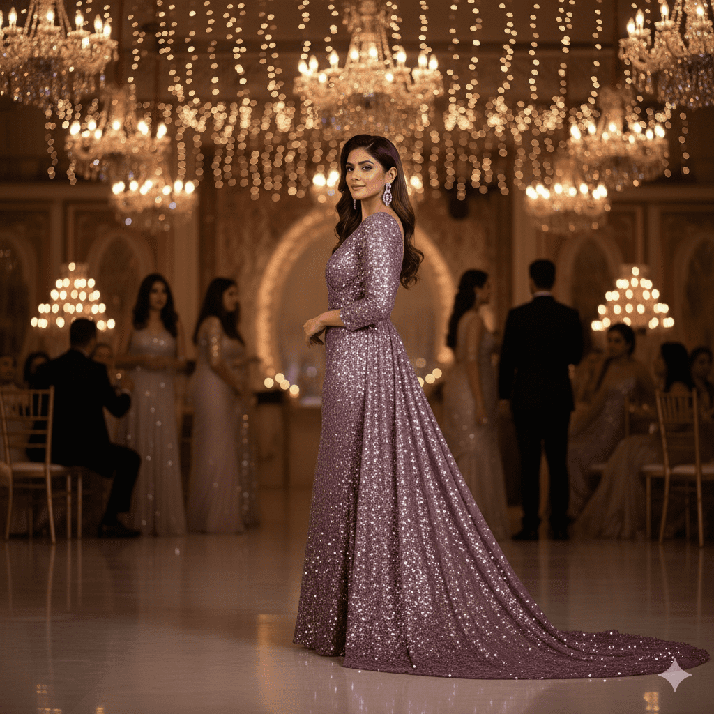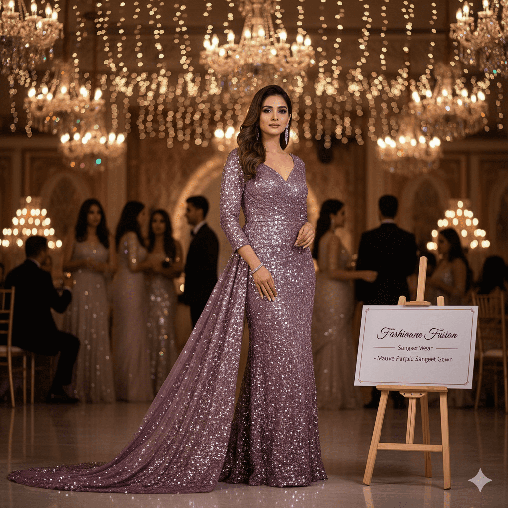 Stylish mauve purple sequin gown perfect for sangeet night. Features floor-length gown with trail. Material: Net with sequins. Work: All-over sequins. Weight: 2.1 kg. Color: Mauve purple. Size: Stitched (customizable). Care: Dry clean. Occasion: Sangeet, cocktail. Fashioane fusion sangeet wear.