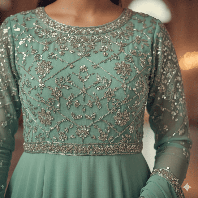 Graceful mint green anarkali bridesmaid dress. Includes anarkali, leggings, dupatta. Material: Georgette. Work: Sequin details. Weight: 1.4 kg. Color: Mint green. Size: Stitched (sizes available). Care: Dry clean. Occasion: Bridesmaid. Fashioane anarkali collection.