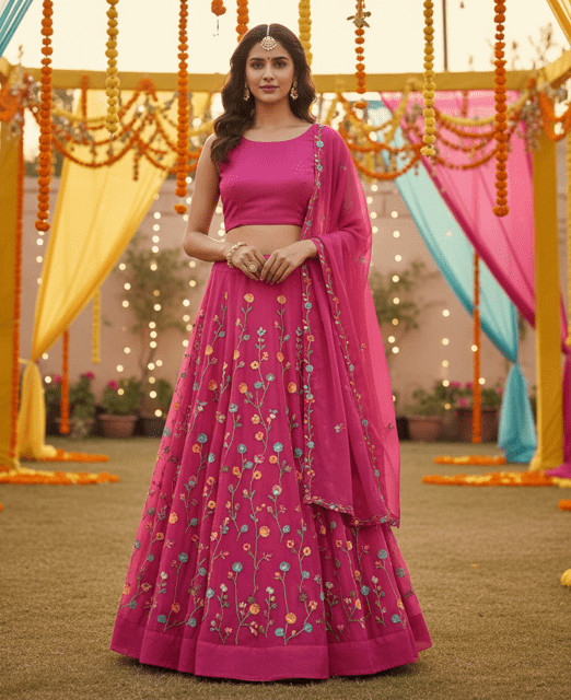 Lehenga: Semi-stitched (waist 28-38 inches). This is a semi-stitched fabric set; images shown are 3D AI-generated visualizations of the finished style to demonstrate the intended look once custom-tailored to your measurements.