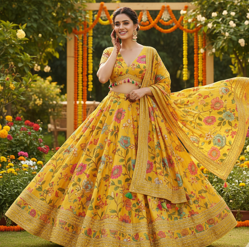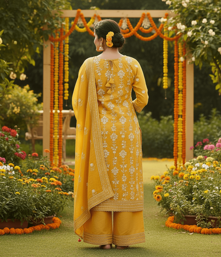 Care: Machine wash gentle or hand wash. Occasion: Haldi ceremony, daytime rituals. Fashioane ritual wear.
