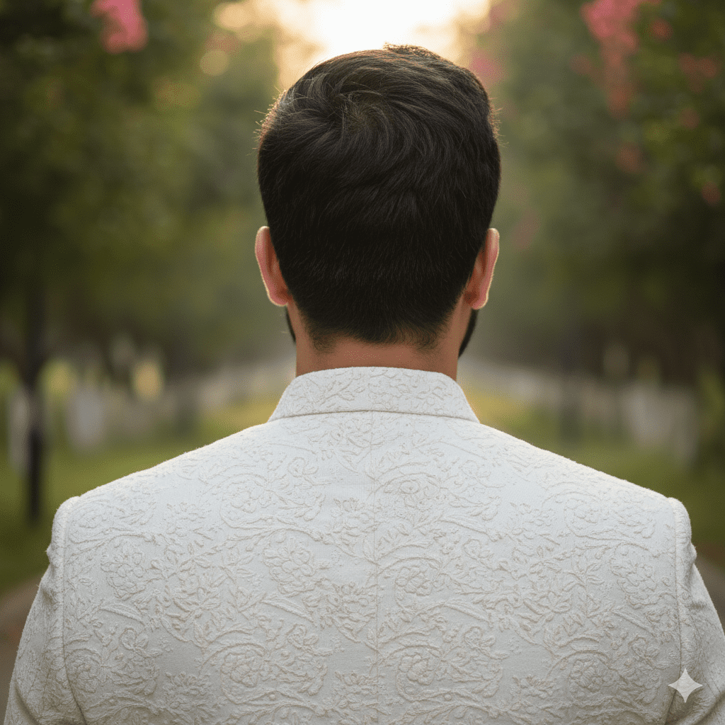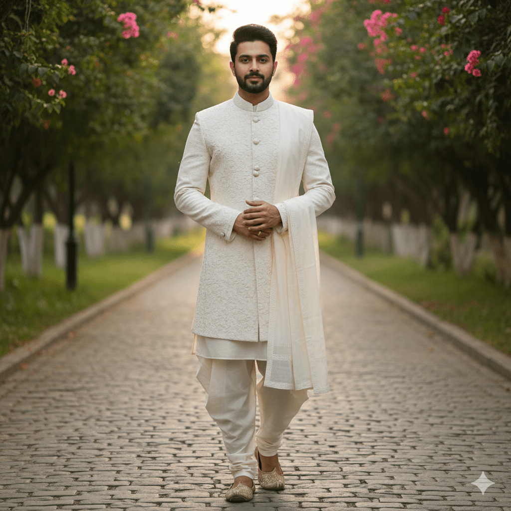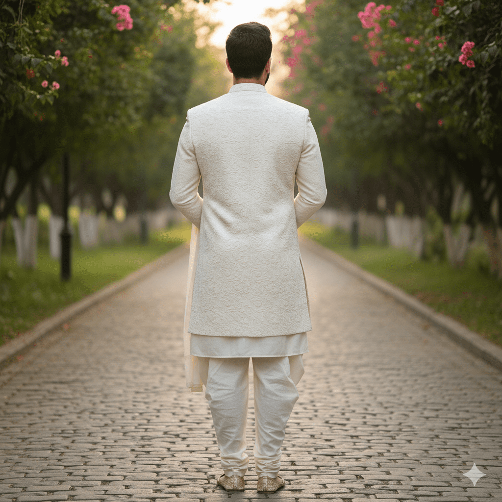 Sustainable off-white khadi sherwani featuring Nehru collar and minimal embroidery. Includes khadi sherwani, kurta, pajama, cotton dupatta. Material: Handspun khadi. Embroidery: Minimal chikankari. Weight: 1.6 kg. Color: Off-white. Size: Made-to-measure (chest 36-46 inches). Care: Gentle dry clean. Occasion: Eco-conscious weddings, daytime ceremonies. Fashioane sustainable collection.