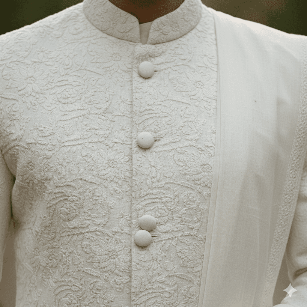 Eco-friendly off-white khadi sherwani with Nehru collar.