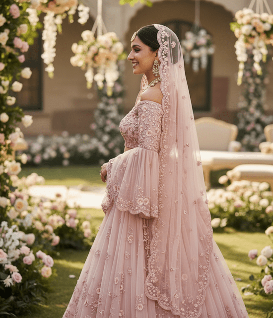 Enchanting pastel pink organza bridal lehenga adorned with delicate thread embroidery and 3D floral appliqué work. Features lightweight organza lehenga with soft flare, off-shoulder embroidered blouse with bell sleeves, and matching dupatta with scalloped edges. Material: Premium organza with net lining. Embroidery: Thread work, sequins, and 3D floral appliqué. Weight: 3.5 kg. Color: Pastel pink with rose gold accents.