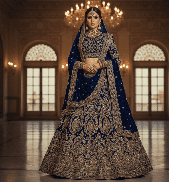 Blouse: Semi-Stitched off-shoulder with drawstring back. Lehenga: Semi-stitched with lace-up waist (24-38 inches). Dupatta: 2.5 meters with embroidered scalloped border. This is a semi-stitched fabric set; images shown are 3D AI-generated visualizations of the finished style to demonstrate the intended look once custom-tailored to your measurements.
