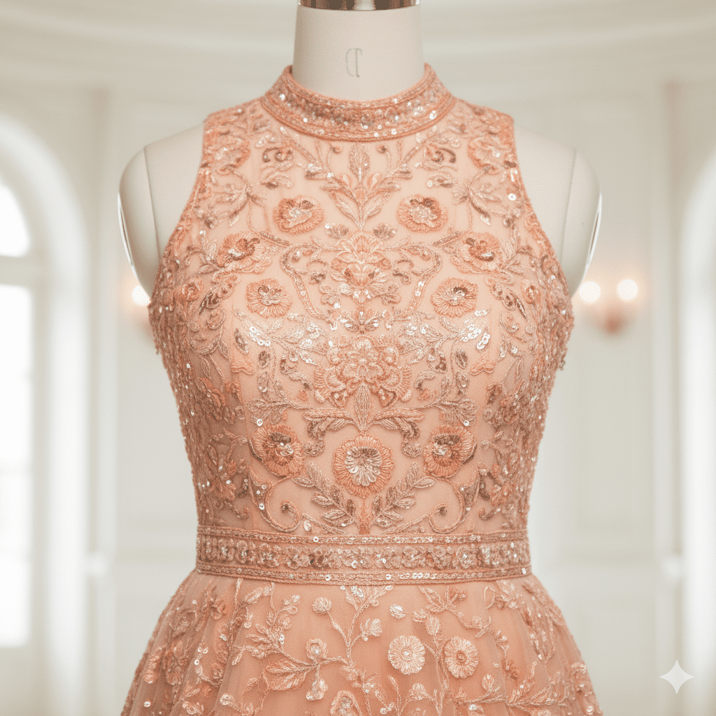 Contemporary peach asymmetric indo-western gown with traditional embroidery. Features asymmetric gown with embroidered bodice. Material: Georgette. Embroidery: Thread and sequins. Weight: 1.6 kg. Color: Peach. Size: Stitched. Care: Dry clean. Occasion: Sangeet, reception. Fashioane asymmetric collection.