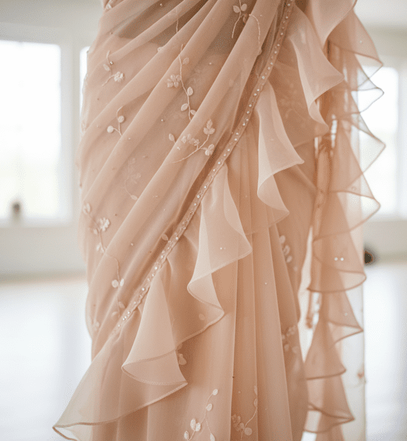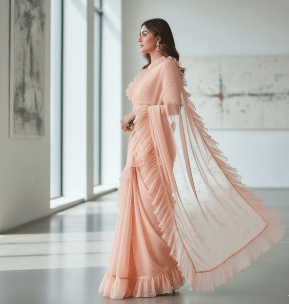 Contemporary peach organza guest saree with ruffle border. Includes 5.5-meter saree, blouse. Material: Organza. Work: Ruffle border. Weight: 0.7 kg. Color: Peach.