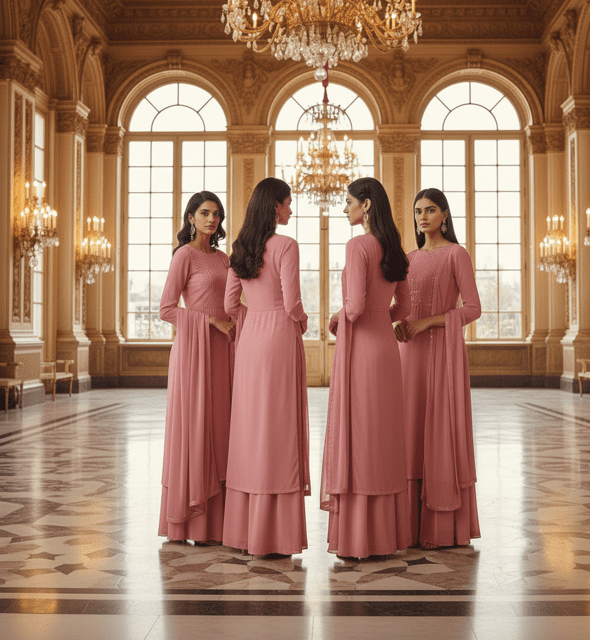 Elegant rose pink georgette kurta palazzo set for bridesmaids. Includes kurta, palazzo, dupatta. Material: Georgette. Work: Minimal embroidery. Weight: 1.2 kg. Color: Rose pink.