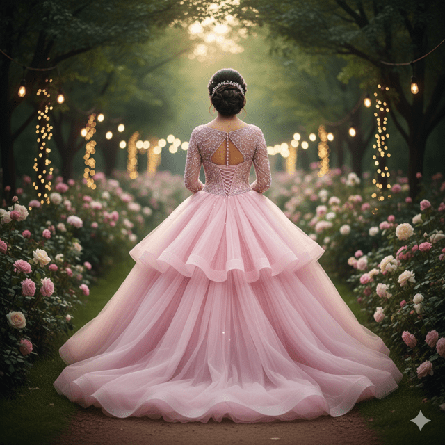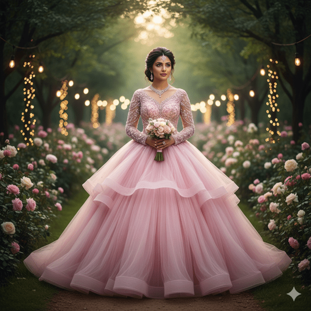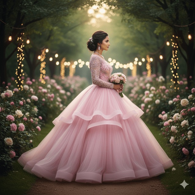Enchanting rose pink organza ball gown perfect for fairy-tale weddings. Features voluminous ball gown, beaded bodice, long sleeves. Material: Organza with tulle layers. Embellishments: Beads and pearls. Weight: 4.5 kg. Color: Rose pink. Size: Custom-made. Care: Dry clean only. Occasion: Grand weddings, outdoor. Fashioane princess gowns.