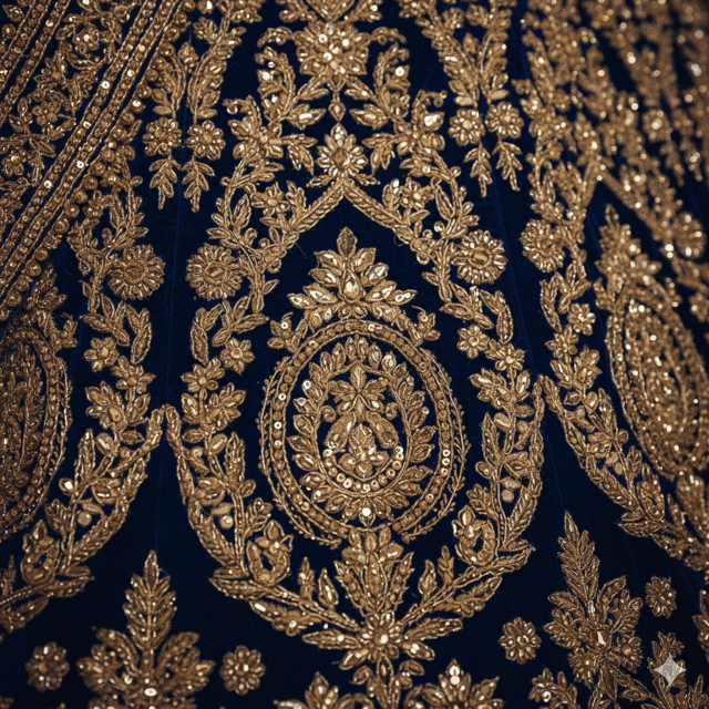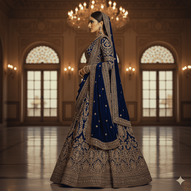 Regal royal blue velvet lehenga with zari embroidery and heritage motifs.