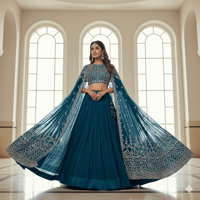 Majestic royal blue velvet bridal lehenga featuring intricate zari embroidery with traditional heritage motifs. Features voluminous velvet lehenga with can-can layers, heavily embroidered long-sleeved blouse with high neck, and velvet dupatta with golden zari border. Material: Premium velvet with satin lining. Embroidery: Zari, sequins, stone work, and threadwork. Weight: 6.8 kg. Color: Royal Blue with gold embroidery. Blouse: Fully stitched with hook closures and high-neck design. Lehenga: Semi-stitched with elastic waistband (26-40 inches). Dupatta: 3 meters with embroidered pallu. Care: Dry clean only, avoid direct sunlight. Occasion: Perfect for winter weddings, north Indian ceremonies, royal-themed weddings. Designed exclusively for Fashioane.