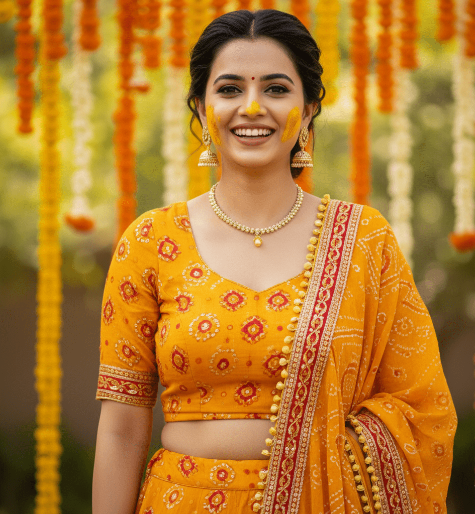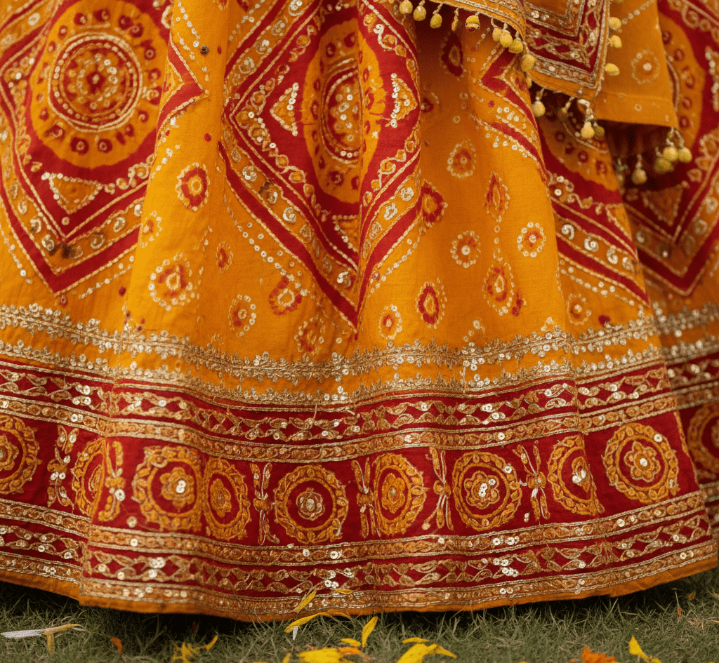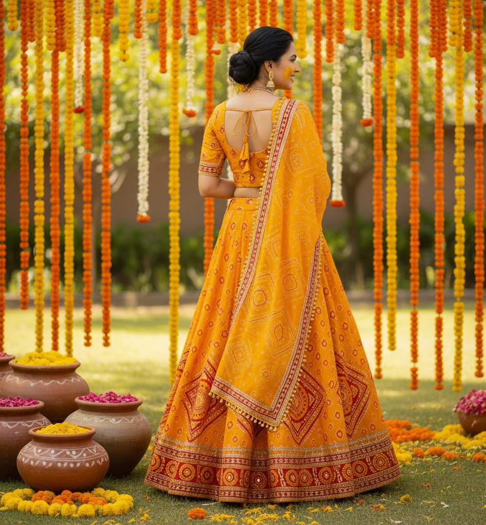 Traditional saffron bandhani lehenga for haldi ritual.