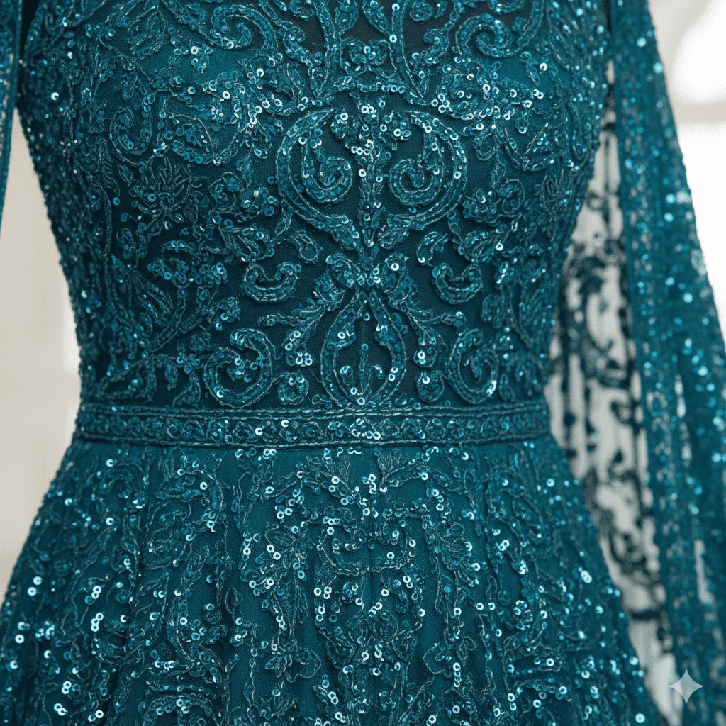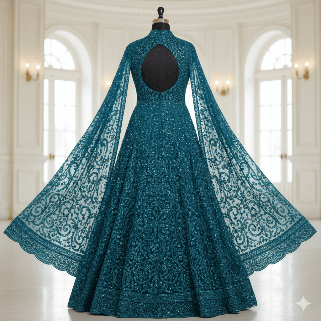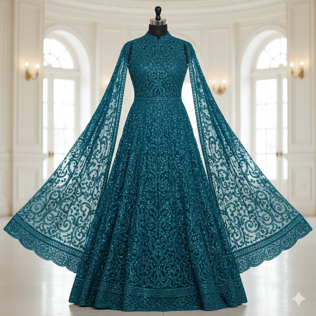 Fusion teal blue indo-western gown with attached cape drape. Features floor-length gown, embroidered cape. Material: Georgette. Embroidery: Sequins and thread. Weight: 1.8 kg. Color: Teal blue. Size: Stitched (custom). Care: Dry clean. Occasion: Cocktail, sangeet. Fashioane fusion wear.