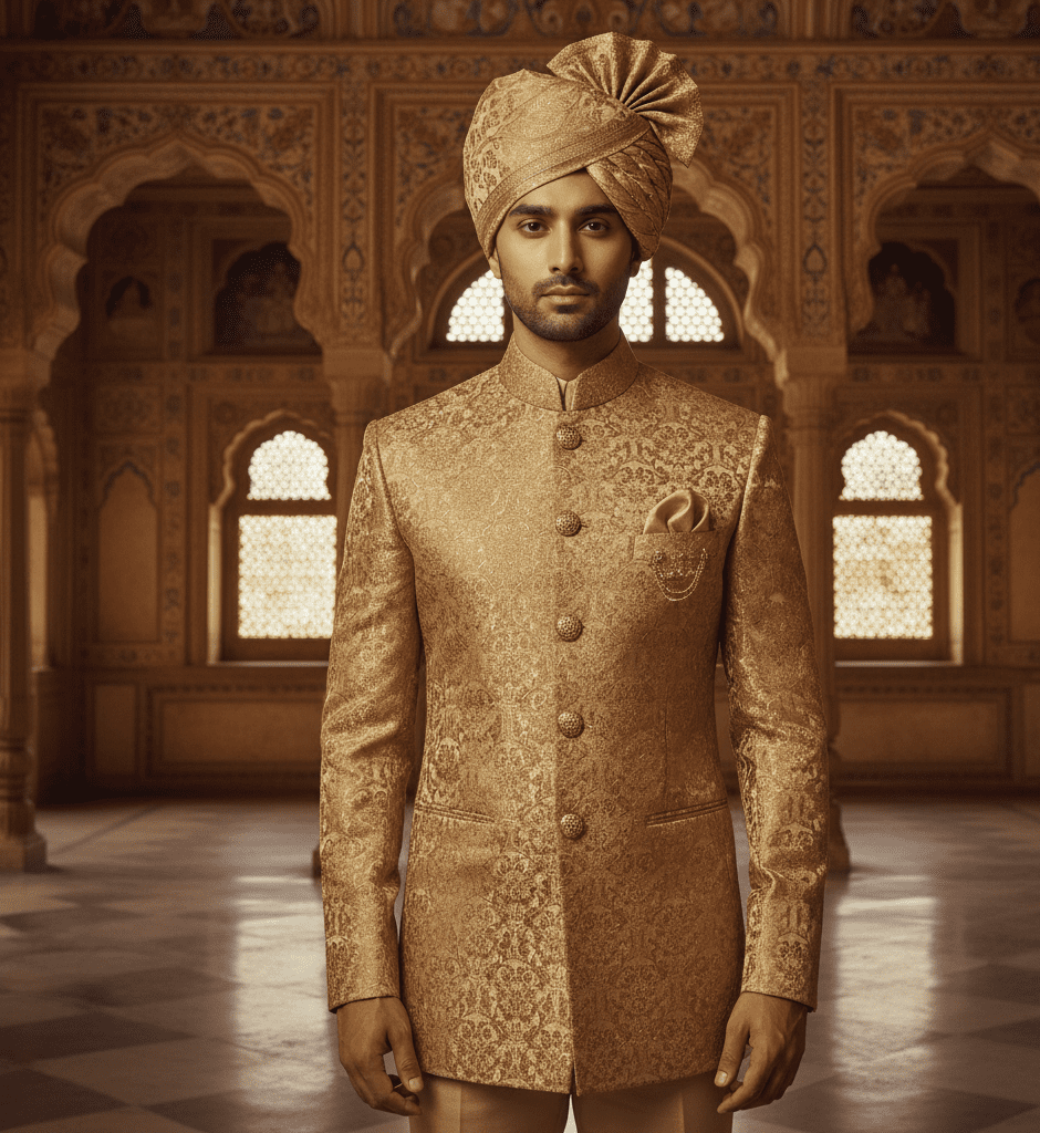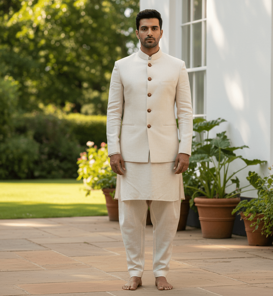 Vibrant teal blue silk bandhgala for festive occasions.