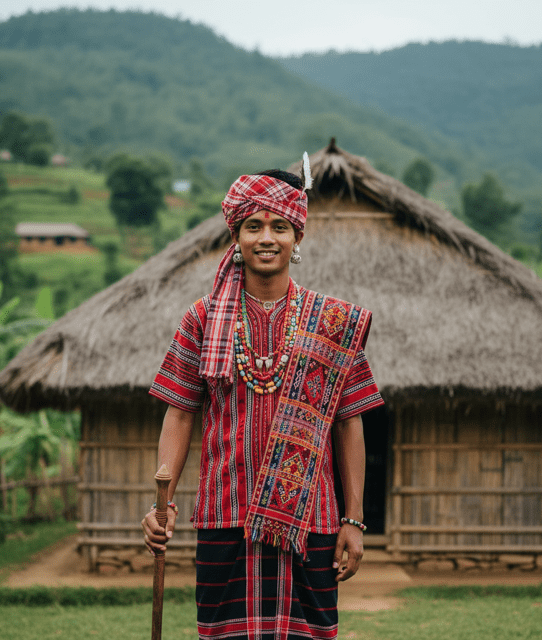 Includes a traditional Nagaland attire that showcases the rich tribal traditions, intricate beadwork, and symbolic headwear of the region.