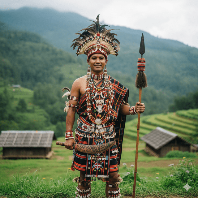 Includes a traditional Nagaland attire that showcases the rich tribal traditions, intricate beadwork, and symbolic headwear of the region.