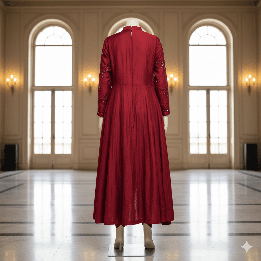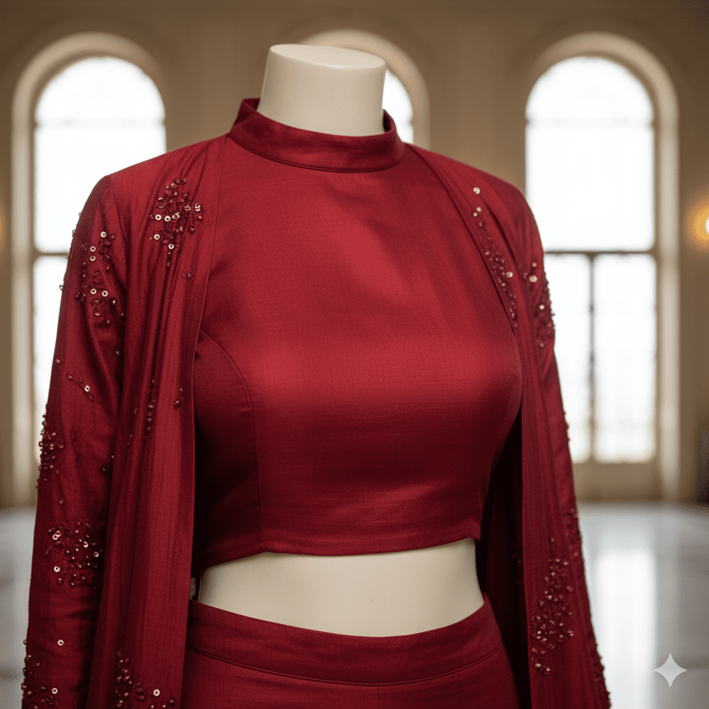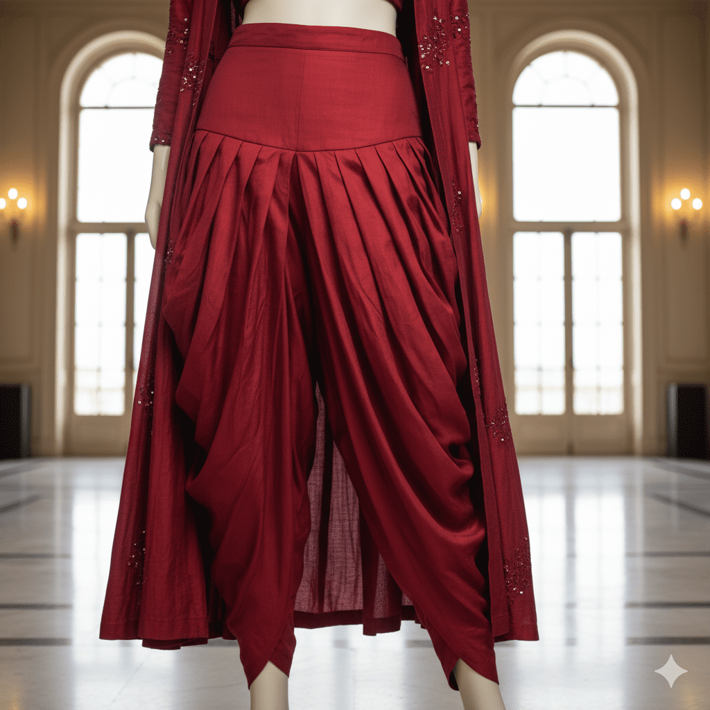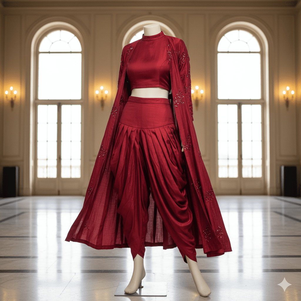 Modern wine red dhoti-style indo-western set with crop-top. Features crop-top, dhoti pants, jacket. Material: Silk blend. Details: Contemporary styling. Weight: 1.5 kg. Color: Wine red. Size: Stitched. Care: Dry clean. Occasion: Sangeet, cocktail. Fashioane dhoti collection.
